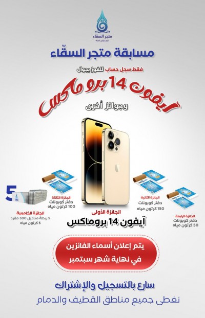 شارك في مسابقة ”متجر السقّاء“ واربح العديد من الجوائز منها: الجائزة الأولى : آيفون 14 بروماكس الجائزة الثانية : دفتر كوبونات 150 كرتون مياه الجائزة الثالثة : دفتر كوبونات 100 كرتون مياه ... |