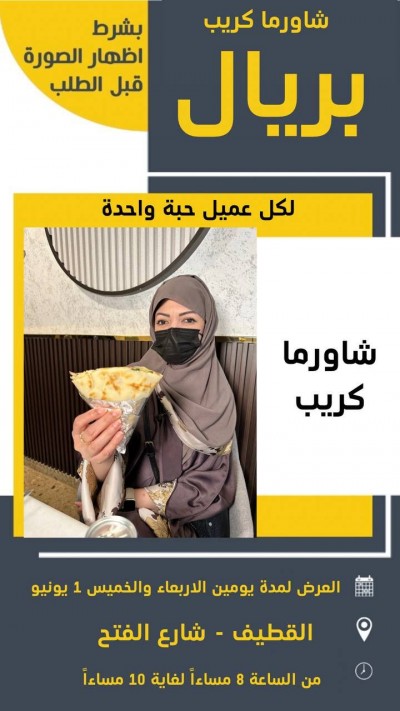 بمناسبة افتتاح «كريب شاورما» بالقطيف الشاورما بريال واحد العرض من الساعة الثامنة مساء إلى الساعة العاشرة مساء يومي الأربعاء والخميس ألذ كريب شاورما مشاوي شاورما على الفحم الانستقرام: https://instagram.com/shawarma_crepe ... |