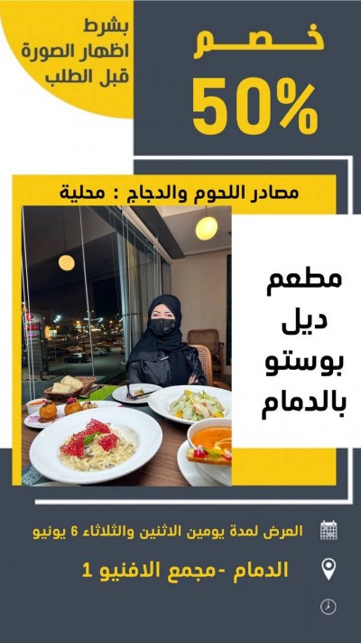 خصم 50% لدى مطعم ”ديل بوستو“ بالدمام