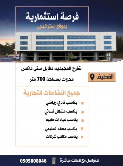 فرصة استثمارية بموقع استراتيجي وسط القطيف محلات بمساحات 700 متر مناسب لجميع الأنشطة التجارية: يناسب نادي رياضي يناسب مشغل نسائي يناسب معهد تعليمي يناسب عيادات طبية يناسب مكاتب شركات موقعنا: شارع القدس - مقابل ستي ماكس.... |
