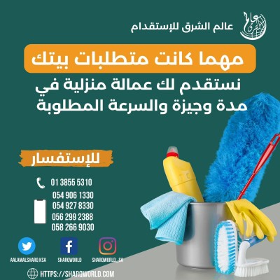 عالم الشرق للإستقدام مكتب إستقدام سعودي يعمل في إستقدام العمالة المنزلية والمهنية مرخص من قِبل وزارة الموارد البشرية والتنمية الإجتماعية لدينا عاملات من: 🇰🇪 كينيا 🇵🇭 الفلبين 🇱🇰 سيريلانكا 🇪🇹 أثيوبيا 🇧🇩 بنجلاديش ... |