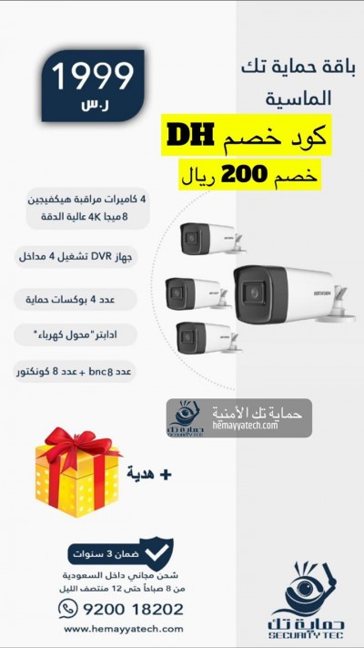 ”حماية تك“ نعمل في مجال بيع وتركيب الأنظمة الأمنية منذ عام 2016، ومعتمدون لدى الأمن الوقائي، ”كاميرات المراقبة، أنظمة إنذار السرقة، تتبع المركبات، الإنتركوم“ متجر ”حماية تك“ المتخصص في حمايتك بشكل متكامل وشامل لكافة ممتلكاتك، بالإضافة إلى تقديم عروض مثالية لحماية المنشآت العامة والخاصة على حد سواء. موقعنا الالكتروني: https://hemayyatech.com موقعنا: الدمام - شارع الأمير محمد بن فهد - مقابل العربية للعود... |