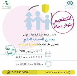 بالتنسيق مع وزارة الصحة يدعوكم مجمع السيف الطبي للحصول على تطعيمة الإنفلونزا الموسمية، ابتداءاً من يوم الثلاثاء 9 نوفمبر 4 ربيع الآخر، وحتى نفاذ الكمية ،من العاشرة صباحاً حتى الثانية ظهراً «التطعيم متوفر مجاناً» .