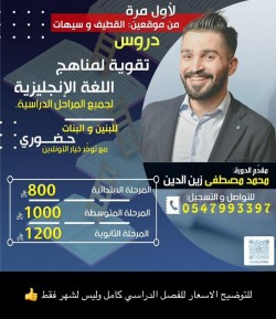 دروس تقوية لمناهج اللغة الإنجليزية لجميع المراحل الدراسية الخيارات المتاحة: حضوري «للبنين والبنات لجميع المراحل الدراسية» مع توفّر خيار الأونلاين عبر منصة زووم 📍الموقع: القطيف - قاعة الشعلة التعليمية «مبنى مكتبة الصفار من الخلف» - شارع القدس https://maps.app.goo.gl/TUfcGktw8EQRiBtx6 الموقع/ سيهات - حي الزهور ... |