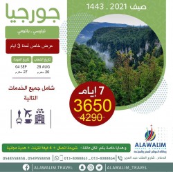 🇬🇪 جورجيا 7 أيام 🔸جورجيا • تبليسي - باتومي •: 7 أيام 2 ليلة تبليسي «فندق إيفيريا إن 4 نجوم» 3 ليلة باتومي «فندق إيفوريا 5 نجوم» 1 ليلة تبليسي «فندق رمادا 4 نجوم» الذهاب: 28 / 08 / 2021 ... |