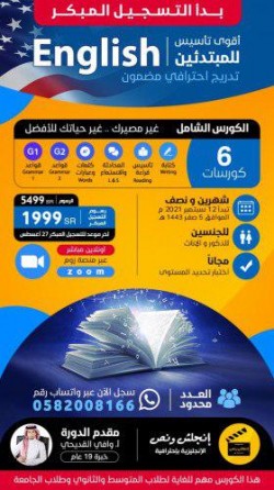 أقوى 600 ساعة تدريبية في اللغة الإنجليزية بشهادتين واعتمادات محلية ودولية 💸خصم 50٪ لعدد محدود⚜️ ☑️ 10 مستويات في اللغة الإنجليزية «600 ساعة تدريبية» خصم 40٪ ✔️بشهادة واحدة معتمدة من وزارة التعليم و✔️شهادة معتمدة من كلية كامبريدج ببريطانيا + خصم إضافي 10٪ لمنسوبي الضمان الاجتماعي ... |