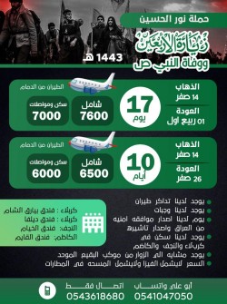 حملة نور الحسين تعلن عن رحلاتها لزيارة الأربعين ووفاة النبي الرحلة الأولى : 17 يوم الطيران من الدمام شامل 7600 ريال سكن ومواصلات 7000 ريال الذهاب | 14 صفر العودة | 01 ربيع أول الرحلة الثانية : 10 أيام ... |