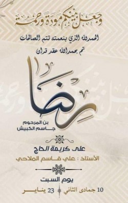 احتفلت عائلة الكبيش والملاحي في سيهات مساء يوم السبت بعقد قران الشاب رضا جاسم الكبيش على كريمة الحاج علي قاسم الملاحي وسط فرحة الأهل والأصدقاء ومحبي العريسين. أسرة ”جهينة الإخبارية“ تهنئ العريسين وعائلتيهما وتسأل الله ان يبارك لهما، متمنين لهما حياة سعيدة. ...