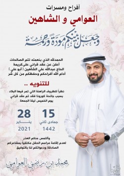 تحتفل عائلة آل عاشور وآل شبيب في الأوجام مساء يوم الخميس بزفاف الشاب مصطفى محسن منصور آل عاشور على كريمة الحاج أحمد بدر آل شبيب «أبو علي» في استراحة محسن منصور آل عاشور من الساعة 7:30 الى 9:30 ليلا وسط فرحة الأهل والأصدقاء ومحبي العريسين. وعبر العريس عن سعادته الغامرة بدخوله القفص الذهبي، سائلا الله أن يوفقه وعروسه ويرزقهما الذرية الصالحة. ونظرا للظروف الراهنة تم تقديم حفل الزفاف هذا المساء ...